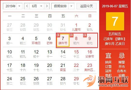 2019年的6月7號-2019年6月9號是放假時間,一共休三天,其中六月7號是端午節(jié)當天是法定節(jié)假日,8號和9號是公休日,實際上雙休的小伙伴只休一天,其他休自己。單休的小伙伴自己體會哈。
