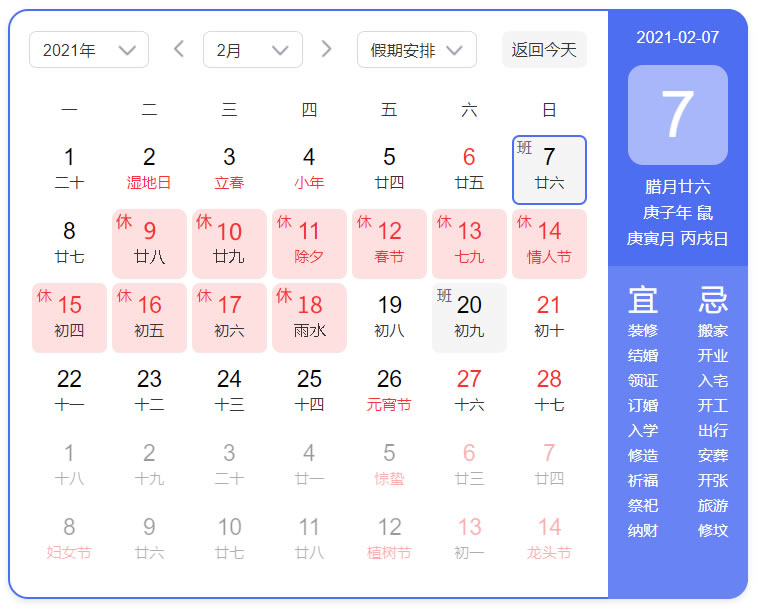 根據(jù)國家法定節(jié)假日安排,并結(jié)合本重慶公司情況,于2月9日——2月18日實(shí)施2021年春節(jié)休假,共10天,于2月19日(正月初八)恢復(fù)上班。休假期間,服務(wù)不斷電(023-65309616)!