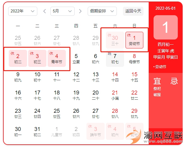 2022年4月30日(周六)-2022年5月4日(周三),共放假5天,其中2022年4月24日(周日)、2022年5月7日(周六)正常上班調(diào)休。