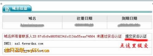 商中的提交流程:通過我們站進入域名管理后,域名信息頁面就可以看到(圖1),未通過實名認(rèn)證,提交實名認(rèn)證>點擊>提交實名認(rèn)證>進入提交自己的個人或企業(yè)信息。